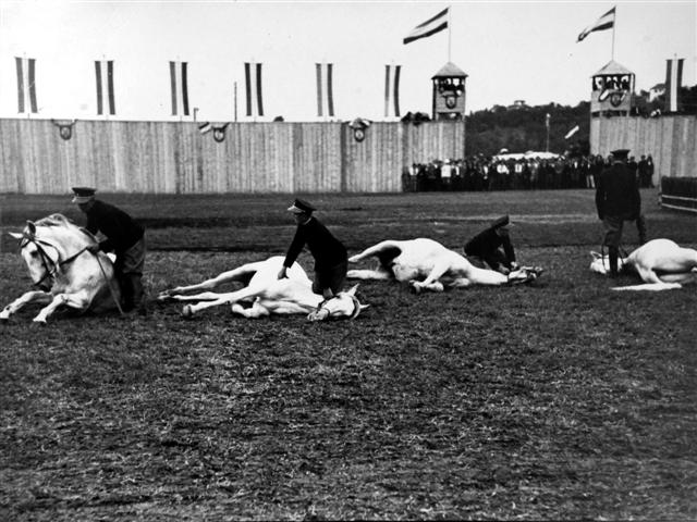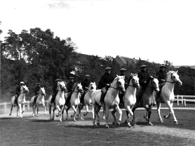 Državna lipicanska ergela - Pastuhsko stanište i Škola lakih jahača u Kutjevu. Lipicanski pastusi pri jutarnjem jahanju u manježu, 1934. godine.
