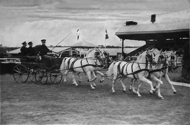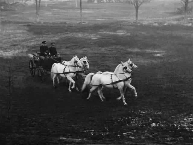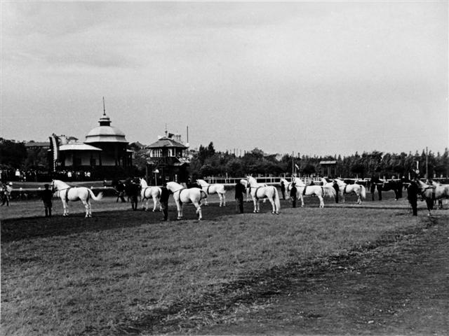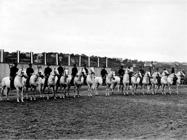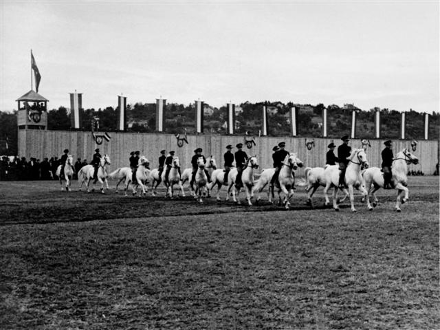 Državna lipicanska ergela - Pastuhsko stanište i Škola lakih jahača u Kutjevu. Lipicanski pastusi pri jutarnjem jahanju u manježu, 1934. godine.